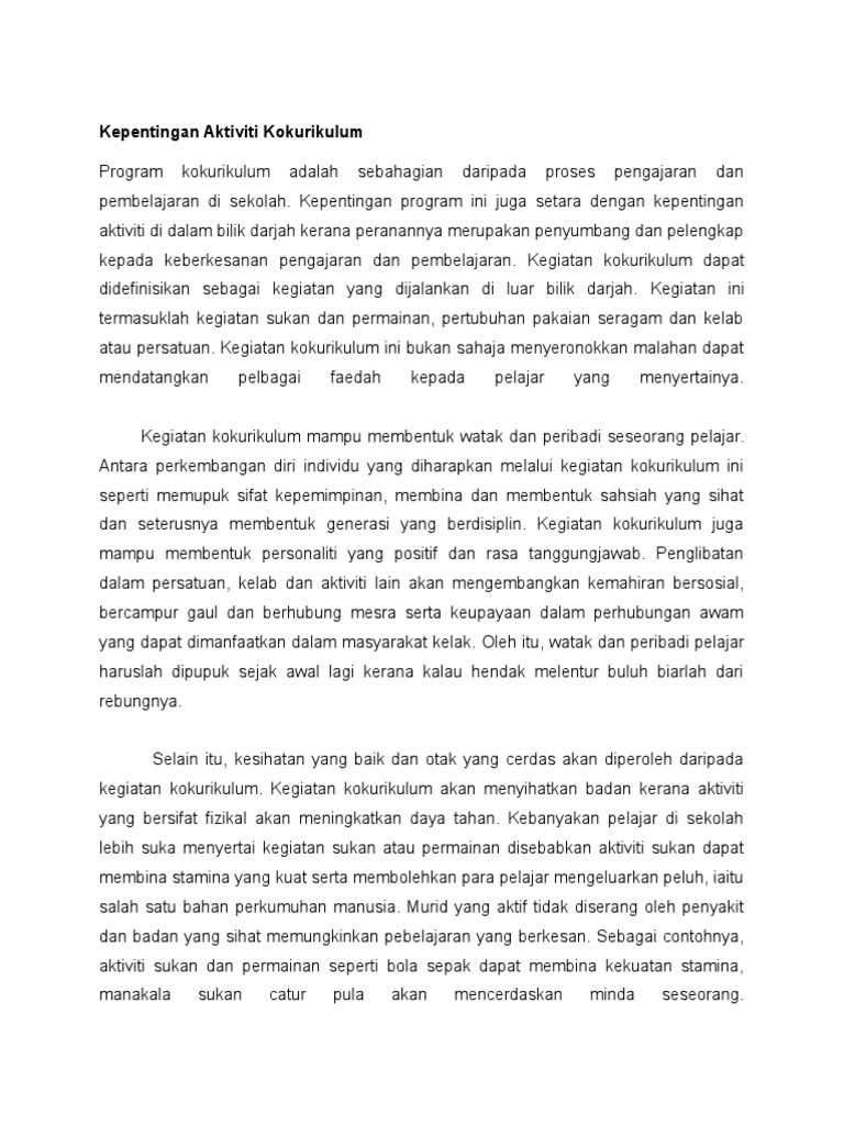Kepentingan Kegiatan Kokurikulum Di Sekolah Kegiatan Kokurikulum Ialah Aktiviti Luar Bilik Darjah Yang Dibimbing Oleh Guru Guru